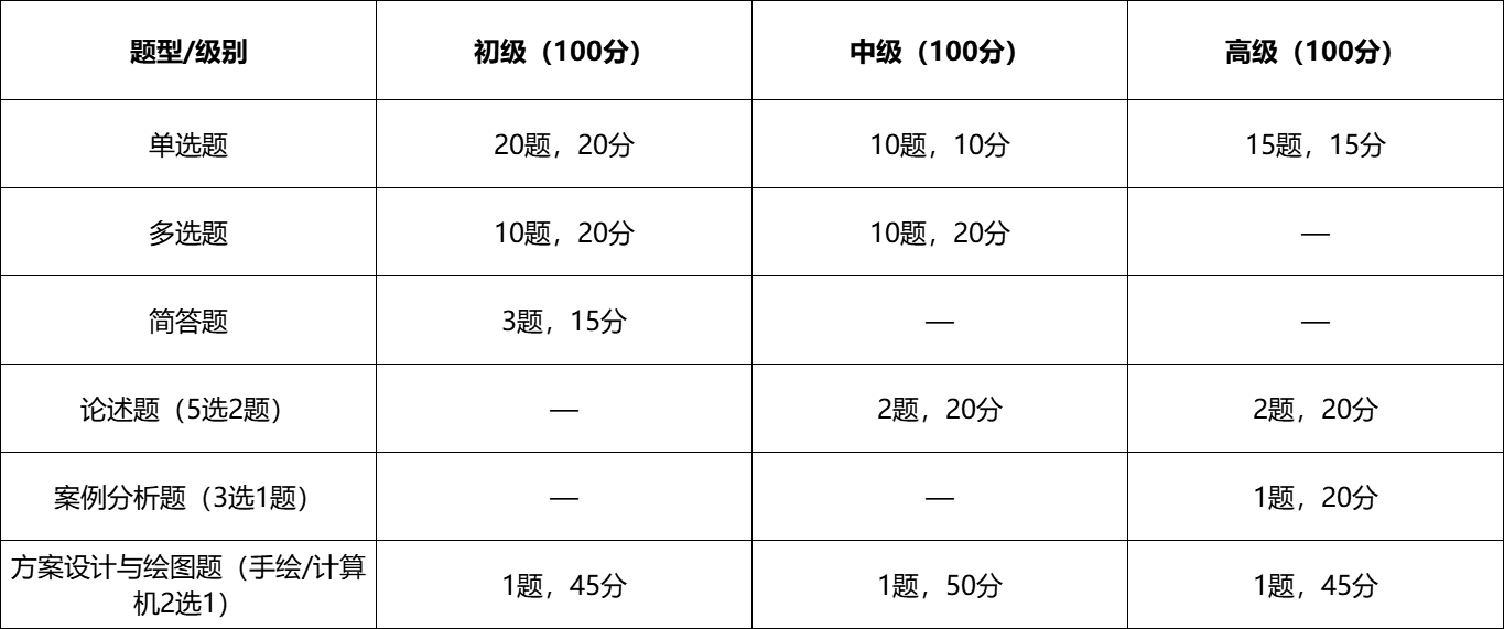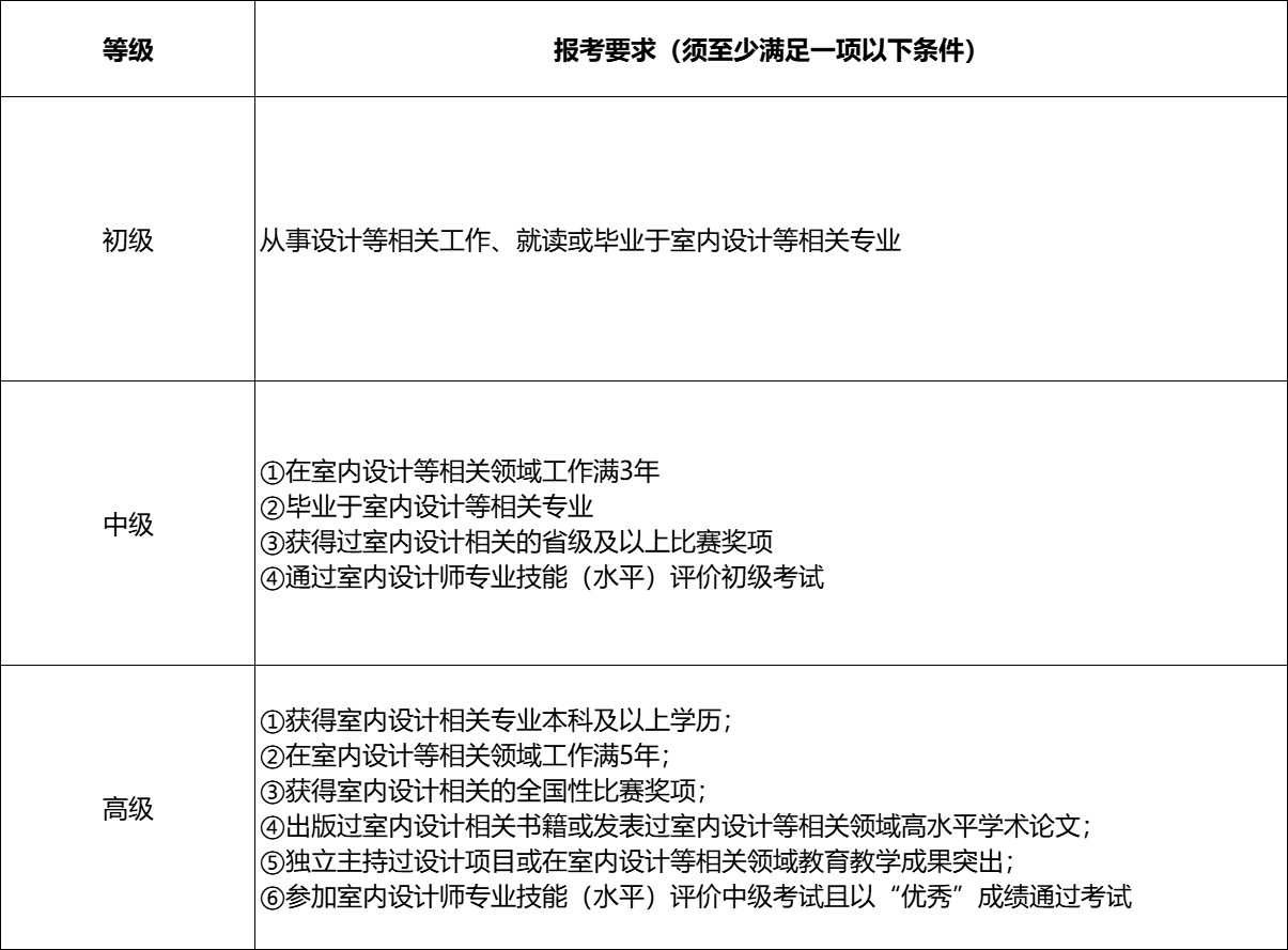 室内设计师专业技能(水平)评价认证考试要求考生了解、理解并掌握室内设计基础原理、室内设计史、人体工程学、室内设计手绘与工程制图、室内装饰设计与监理、室内装饰材料与构造及计算机辅助设计等相关专业知识。